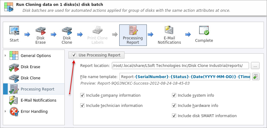 In order to get the reports generated, simply select and configure them during the process of Disk Clone setting or in